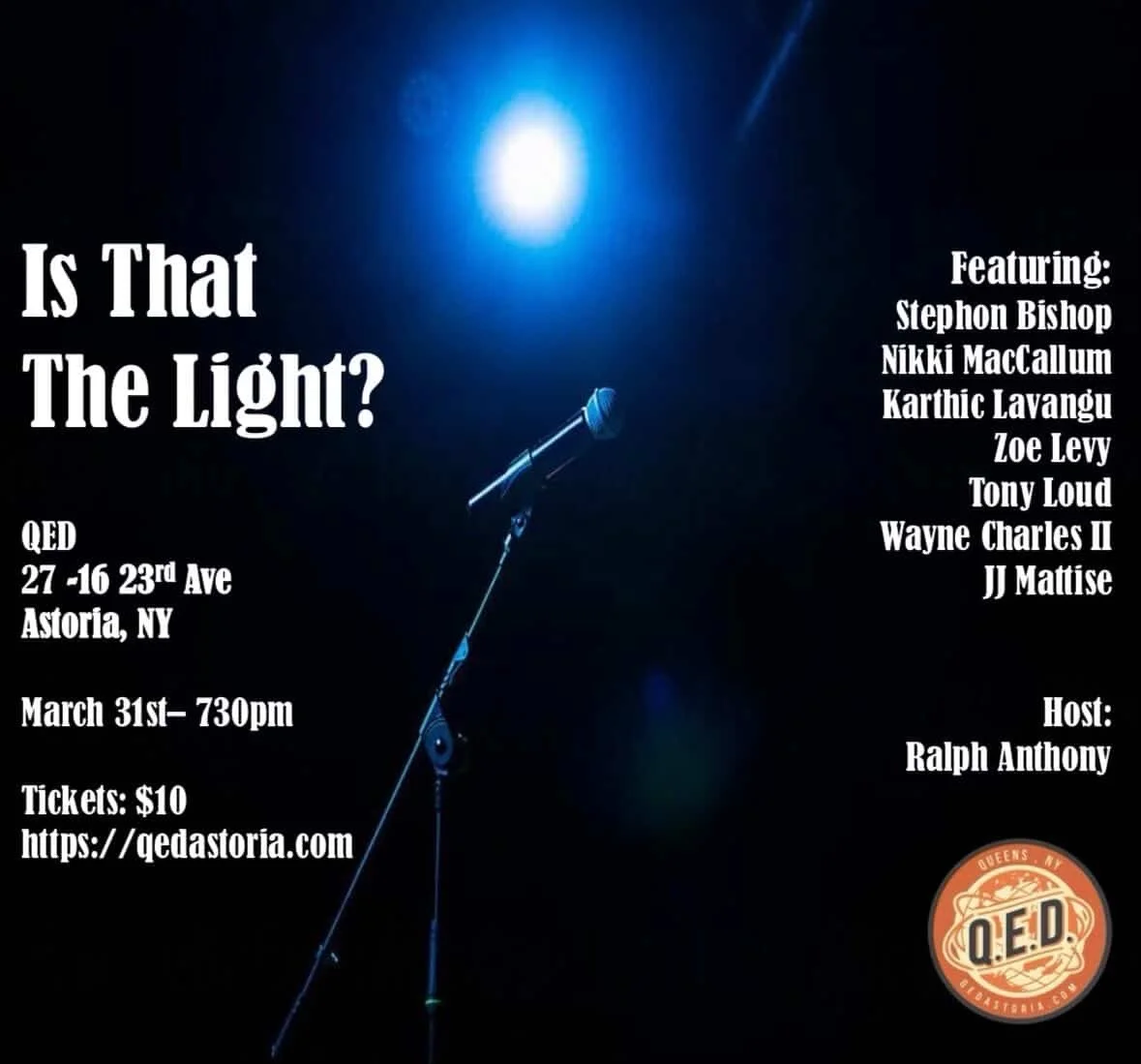“Is that the Light,” is a New York City based live stand up comedy show produced in the heart of Astoria at QED. It’s hosted by Ralph Anthony, and features some of the top comedians from all over the country. They’ve been featured on the late night TV, Netflix, Amazon Prime, the NY Comedy Festival, and JFL to name a few. Audiences will be in for a fun time and guaranteed laughs so come out and enjoy the show.